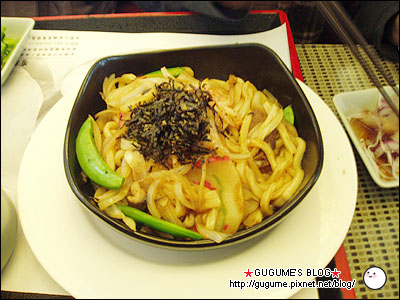 這是亮同學的180元韓式泡菜牛肉炒烏龍麵(也有附一杯甜到不行的冰茶)