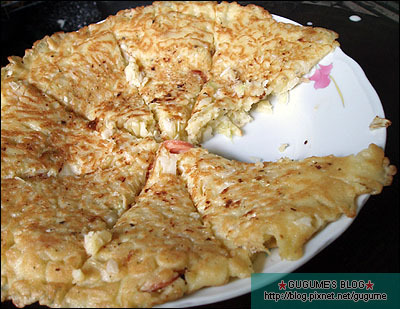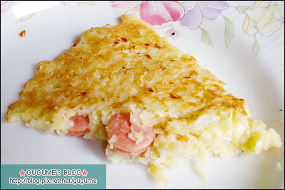 宅女廚房菜單-香腸蔬菜煎餅宅女廚房星期日又開張了原因是有一包麵粉已經開封很久阿母要我趕快把它用完所以就又隨手弄弄小香腸是之前拍照的食材一直放在冰箱裡因為阿母不知要如何拿它做菜所以我就把它切小片一起和在麵糊裡跟著高麗菜和蛋一起攪拌均勻起油鍋 煎出這一大片餅出來把它當披薩來吃味道當然是天南地北啊<囧再來用高麗菜+蔥花做的純蔬菜煎餅最後再來個蔥油蛋餅嗯下次想自己做麵糰因為用麵糊煎的餅還是不夠香啊